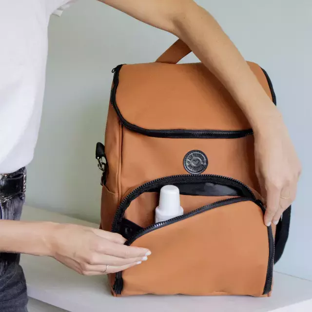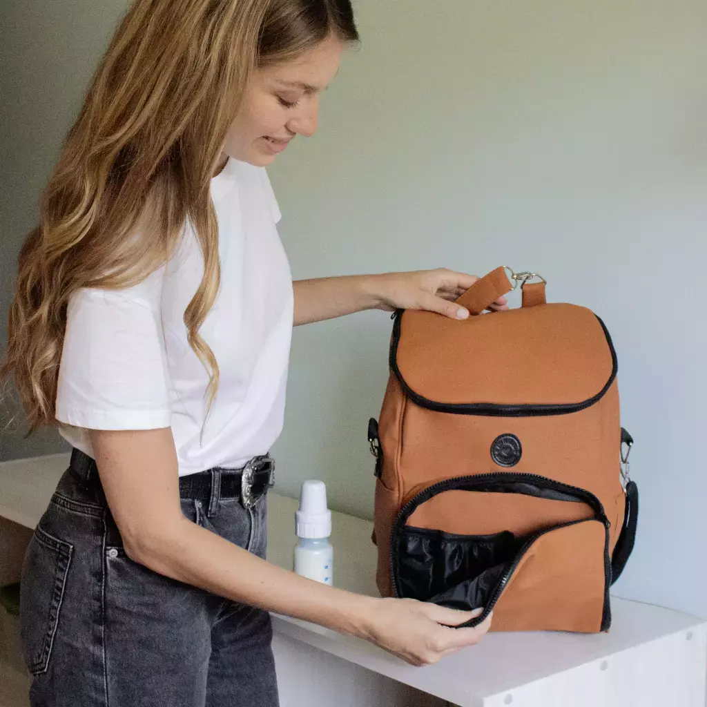 Cuenta con una amplia apertura frontal y un práctico bolsillo térmico para dos mamaderas, manteniendo todo al alcance de tu mano. Su interior impermeable y los bolsillos laterales aseguran una organización eficiente y fácil acceso.